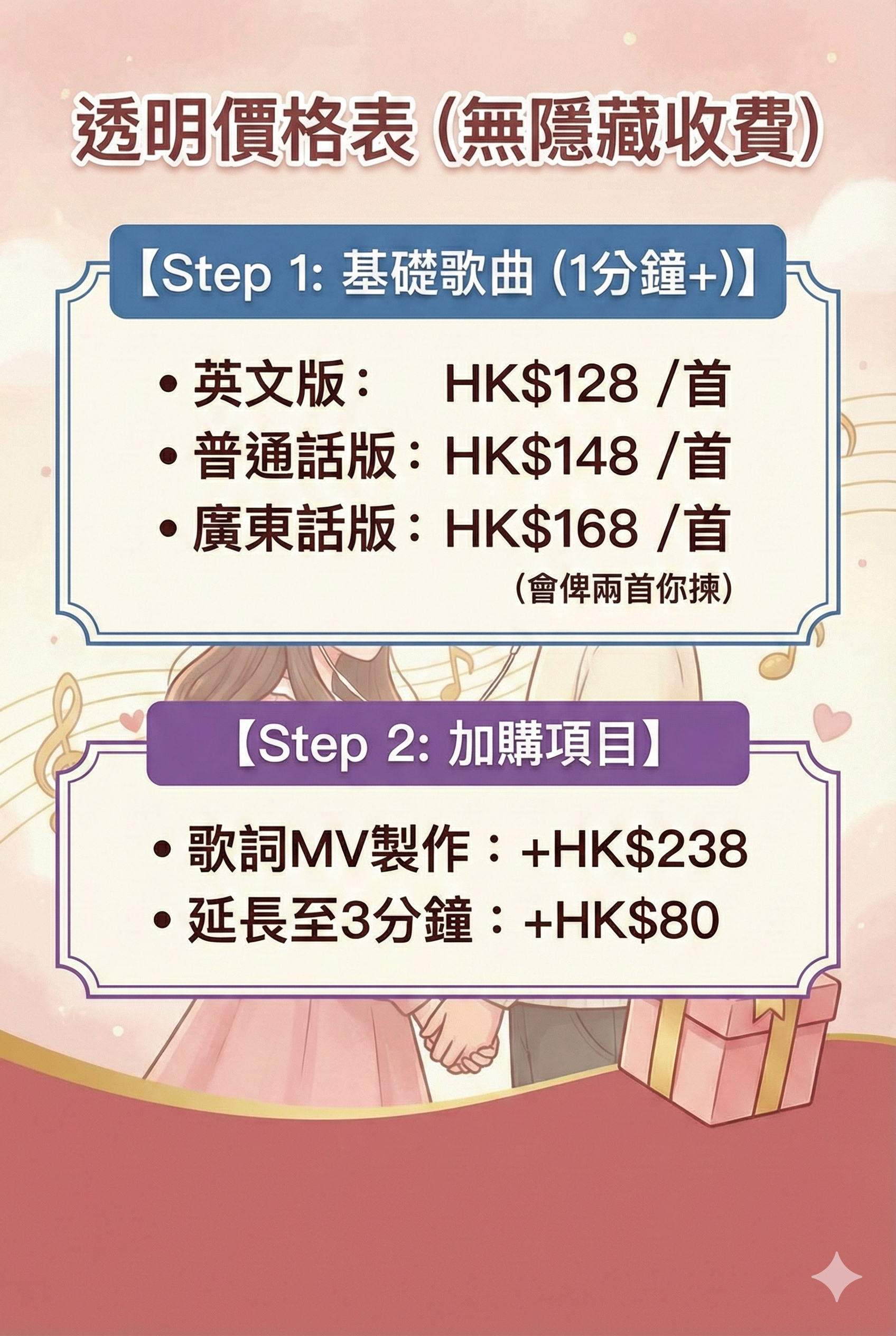 • 歌曲增長至 3 分鐘以上 +HK$80