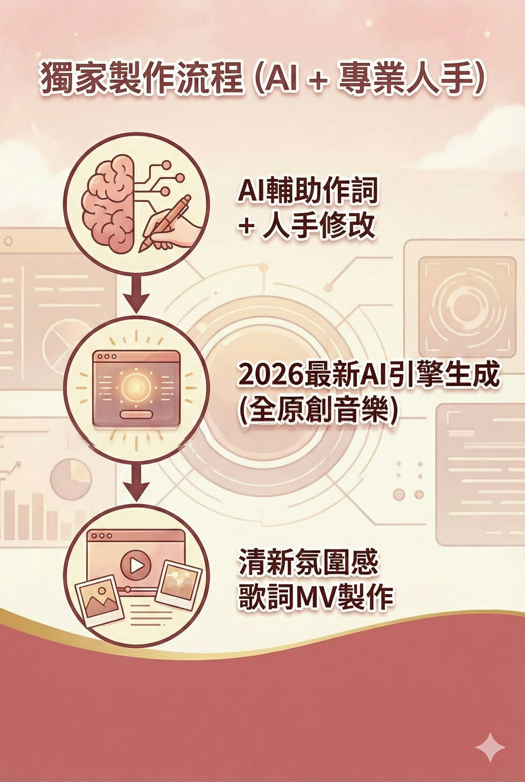 • 我們會根據你提供的資料主題、感覺或故事,生成歌詞(AI輔助,人手修改) 再生成兩首不同Melody/風格的完全原創AI歌曲供你選擇(包括旋律、編曲、演唱聲線)。(使用2026最新AI版本,品質大幅提升!完全原創,非翻唱)